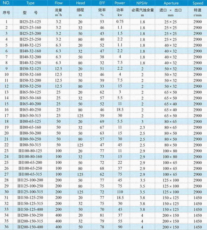 IH型不銹鋼耐腐蝕泵性能參數(shù)表: