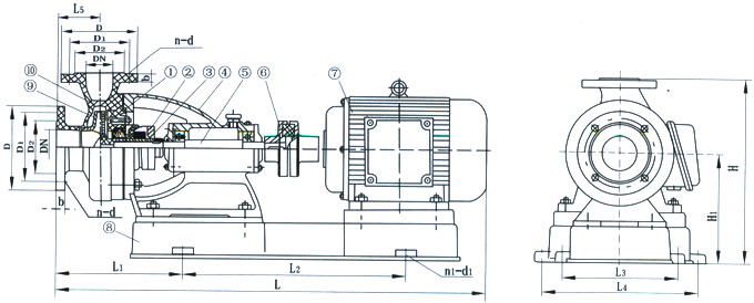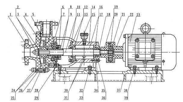 6、如果更換滾珠軸承或泵軸時(shí),必須拆下機(jī)架,松開前端軸承蓋4只螺釘。拆下泵軸后端 螺母和聯(lián)軸器,將泵軸向前端方向打出即可,再后拆下后端軸封蓋。