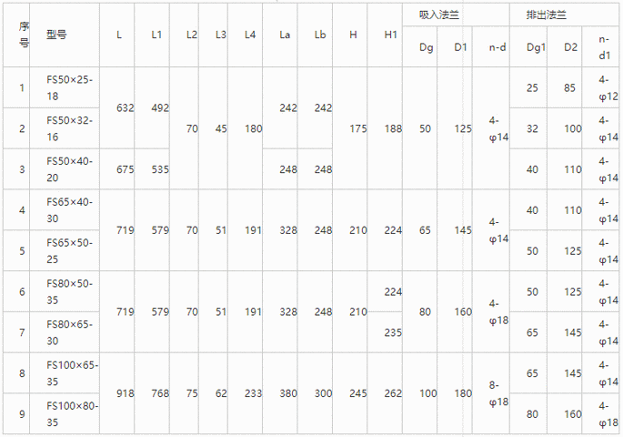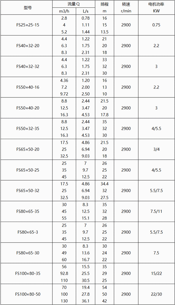 FS型玻璃鋼離心泵性能參數(shù)表: