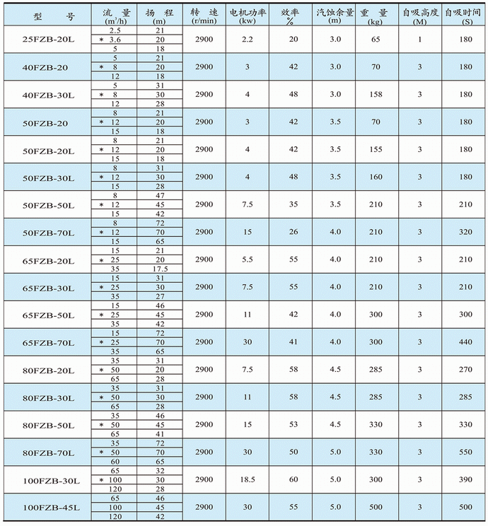 FZB型氟塑料自吸泵性能參數(shù)表: