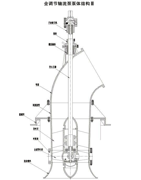 ZLB、ZLQ型泵系單級(jí)立式軸流泵。其結(jié)構(gòu)分為泵體部分和傳動(dòng)部分。泵體部件有喇叭管、葉輪部件、導(dǎo)葉體、彎管、軸承、填料函和聯(lián)軸器等。傳動(dòng)部分有傳動(dòng)軸的一端通過聯(lián)軸器與電動(dòng)機(jī)連接,另一端與水泵連接。泵的軸向力由電動(dòng)機(jī)座(或軸承座)內(nèi)裝的軸承來承受。軸封采用填料密封。傳動(dòng)中水泵葉輪的轉(zhuǎn)向,朝吸入口看,為逆時(shí)針方向。