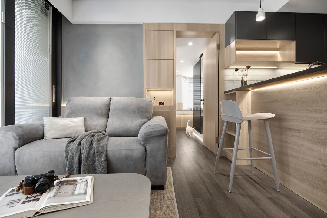 傳統(tǒng)電視柜改為滿墻的收納柜設(shè)計,局部的開放柜作為展示,空調(diào)做隱藏設(shè)計處理,讓空間更加的美觀。