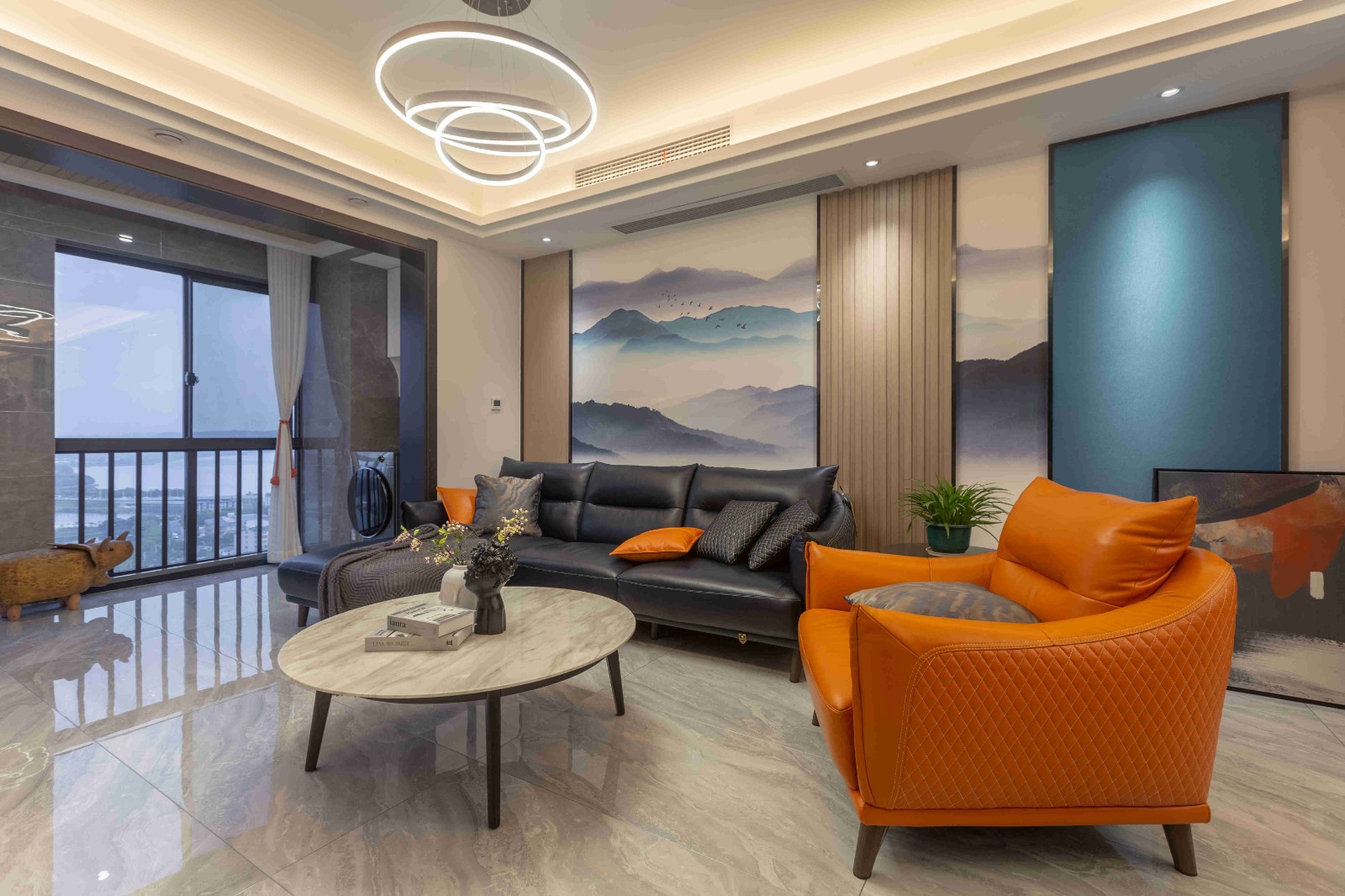 橙色單人皮質(zhì)沙發(fā),造型獨(dú)特的工藝吊燈,電視墻左側(cè)佇立的木柜,都為客廳的灰藍(lán)白色調(diào)增添了色彩。