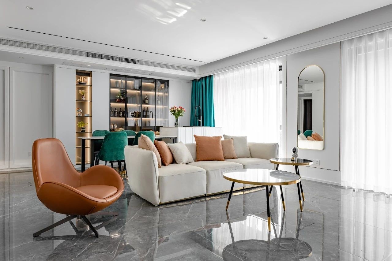 整體以灰白為主,用墨綠、橙色、金屬元素作為點(diǎn)綴,勾勒出空間層次的線條感,營(yíng)造一種活潑輕松的氛圍
