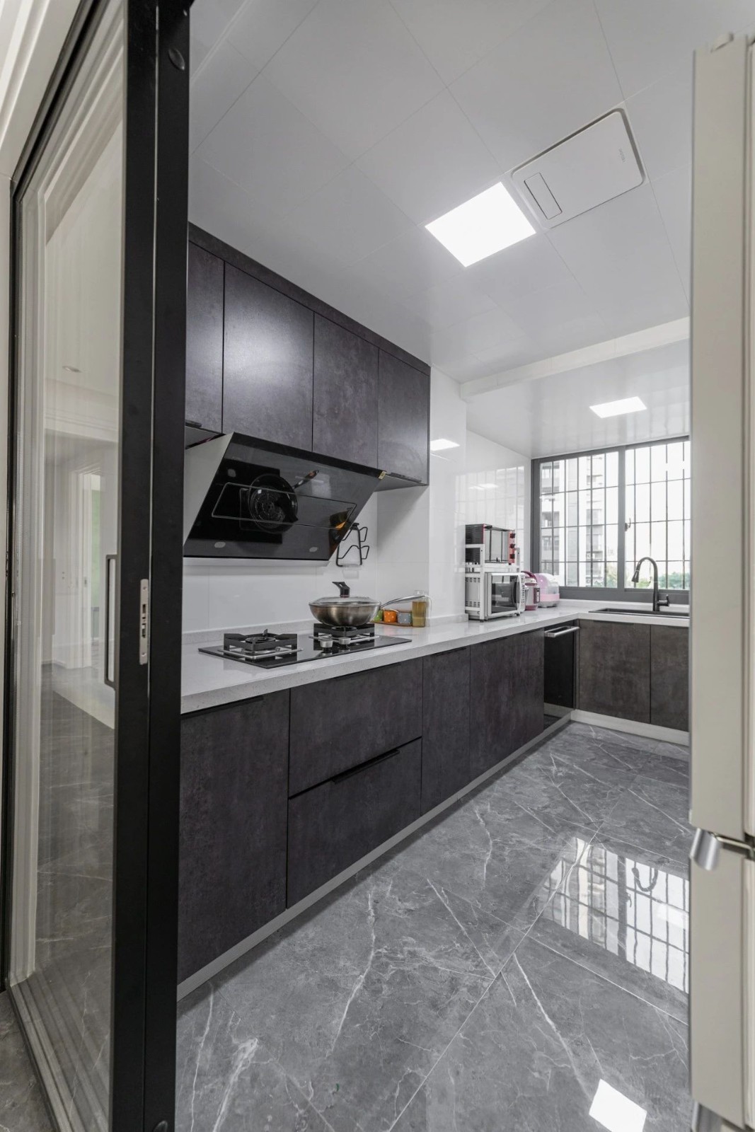 廚房的深色設(shè)計(jì),仿佛沉淀了所有煙火氣,玻璃移門(mén)讓空間更加通透明亮,也能看到孩子在客廳的活動(dòng)狀態(tài)。