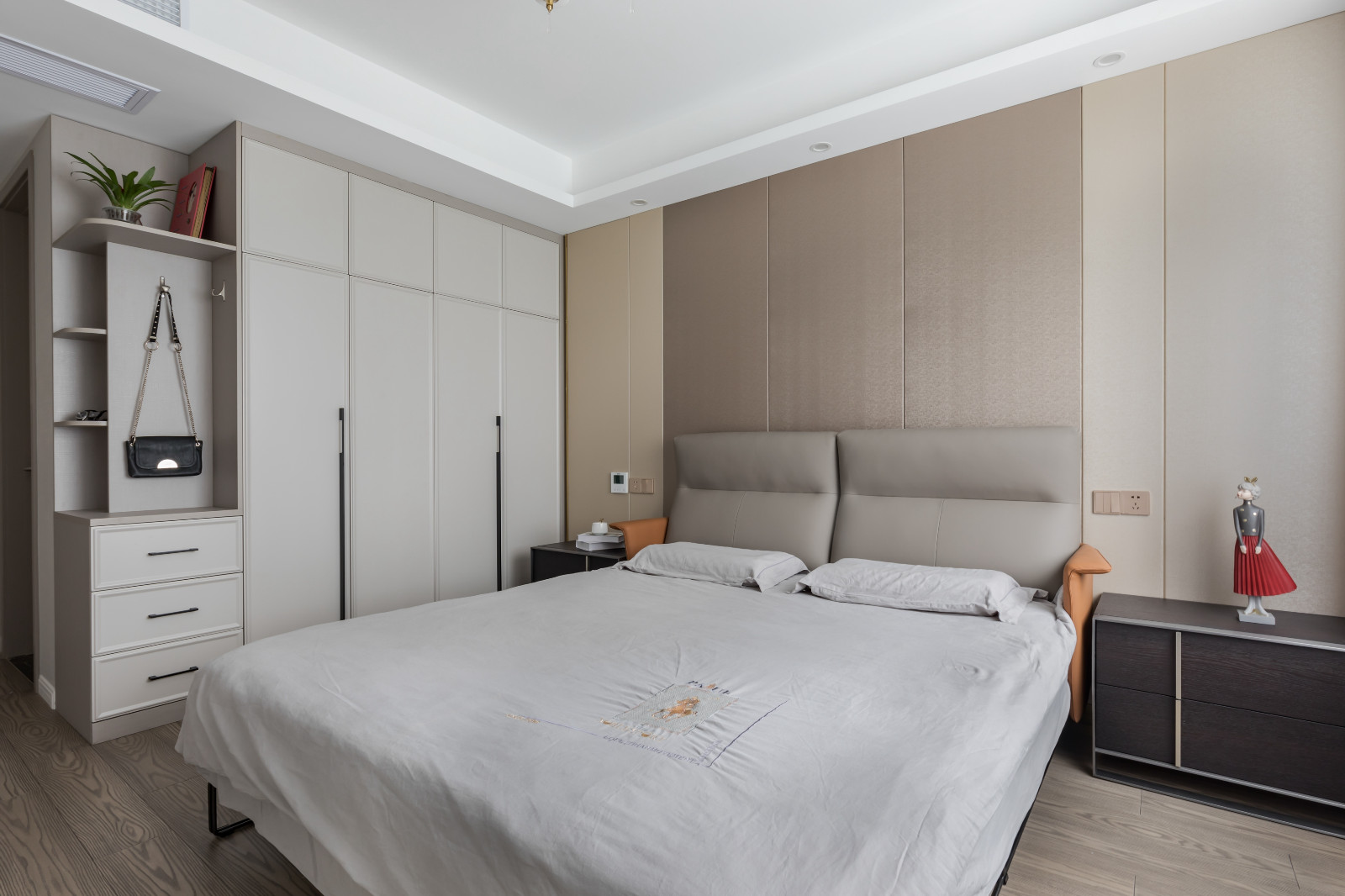 主臥整體灰調(diào),淺色灰背景墻,搭配深灰色皮質(zhì)床靠背,棕色木紋家具經(jīng)典。